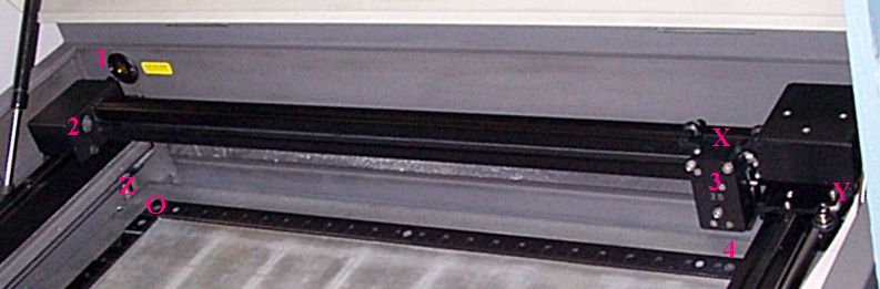 How it works is quite simple. In the back of the machine, there is a 50-watt CO2 laser tube. There are mirrors and lenses, which get the laser beam, to the yellow lens at point 1 in the picture below. At point 2 there is a right angle mirror, that redirects the beam to point 3. At point 3, there is another right angle mirror that points the beam downward. Along with the mirror, there is a lens that focuses the beam to point 4. The lens that I used had a two-inch focusing distance. You can see there are 3 screws at point 3; the right angle mirror, and lens assembly comes out for cleaning. I don't know why, but I was surprised that the laser beam was not enclosed in its travels. You can see from the top picture on this page, that the user is protected from the working compartment, by the top lid of the machine. The window is coated to protect the user's eyes from stray laser light. The beam is moved around by 2 slides. The Y slide is the beam that is between point 2 and point Y. It travels on rollers at points 2 and Y. You can see these rollers at point Y. So this bar travels back and forth, from the front of the machine to the back. Gezz this sounds so dry and technical! Anyway, the lens assembly, or laser head, at point 3, is the X-axis. It travels from left to right, on rollers at point X. These two slides are move with cogged belts, which are moved with stepper motors. The bed of the machine travels up and down on four lead screws. One of them can be seen at point Z. These four lead screws are powered by cogged belts that are all powered by one stepper motor. The reason the table moves up and down is so you can focus materials of different thicknesses. The bed of the machine will go down 8 inches, in case you had something 8 inches thick to be cut or engraved. This comes in handy if you wanted to engrave a trophy, or the back of your boom box.