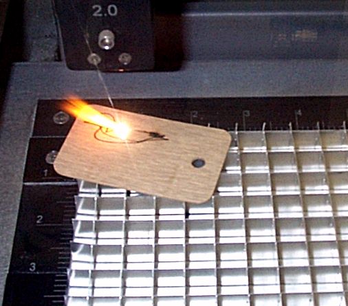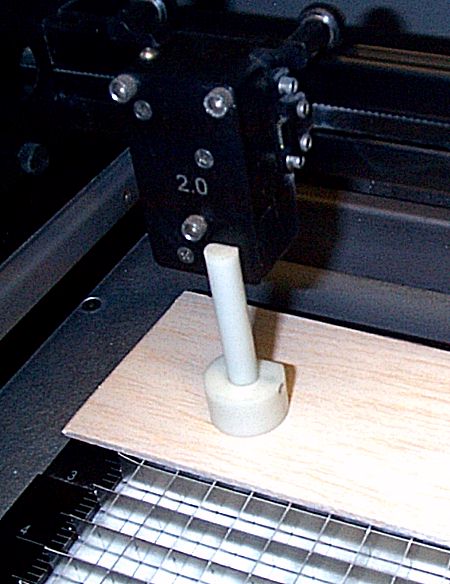 Speed of the Cut Simply knowing the laser power is only half of the equation to cutting, how quickly you move that laser over the material determines how much burning power you are applying to any one spot. It's pretty linear on how it works. If you double the thickness, you have to double the power to cut at the same speed. What speed to cut at really has to be determined by experimentation. Pulses Per Inch (PPI) The laser burns by not by a steady stream, but by individual pulses. On this laser I could slow down the pulses enough that I could perforate material, kind of like postage stamps. If the laser burns a .005" hole when it cuts, you could make a cut with 200 pules. This would be similar to cutting 10 inches of plywood with 40 1/4 drilled holes. It would cut it, but the edges would be rough. Some materials are like this. I cut paper up at 1000 pulses per inch (PPI). On the other hand, the edge on acrylic melts together when you are cutting it, for this I found a setting of 200 PPI was perfect. Number of Passes This factor is pretty straightforward. The more the passes, the deeper you can go. With the older lasers this was very important. Having a 15 watt machine you have to do like 3 or 4 passes to cut though a 1/8 thick plastic sheet. On some materials such as acrylic, you can only cut so much in one pass, as the laser heats up the surrounding material too much and causes the part to warp. Parts will also warp if you have thinner wall thickness. More passes are required. Some times with materials that have low melting points, you may want to give the material a chance to cool down before hitting it again. If you have too much material in a molten state it's going to glob back together after it cools down. Also with multiple passes you might have to play some focusing tricks, see the focus section. Materials I plan on writing many more articles about different materials that you can cut on the laser. Basically with this low powered machine, if you can burn the material with a match, you can cut it with this machine. The problem comes into play with nasty vapors, residues, and dust. PVC and polycarbonate vapors are down right poisonous. You don't even what to be venting this stuff out to your neighborhood. That said, some laser shops boost their ability to cut polycarbonate! Fiberglass has nasty vapors as well as glass fibers that can mess the precision slides and optics. But cutting it sure comes in handy; you can cut your own circuit boards. Cutting Corian, that is solid surfacing countertop material is really handy. Mostly shops engrave it, then fill it with epoxy. It makes for a beautiful inlay. Again this stuff is nasty because it has bits of rock, grit, glitter, what ever else they toss in there that makes it look so good. All that grit gets into the machine, and you have to clean it more often. So that said, what does it cut nicely? It's a long list. There are plastics that are engineered to be cut with lasers. They have bi and tricolor sign plastics that look oh so nice. Acrylic just rocks on the laser. It cuts with a perfect polished edge, and it does so with like no fumes. When acrylic burns it releases CO2 and water. That's it, plus maybe some modifiers that are in there. A lot of the laser cut-able plastics are a form of modified acrylic. What else? With success I have tried thin polypropylene, polystyrene, ABS, acetate, rubber (a little nasty), Delron, rubber stamps, matting for picture frames, vinyl, labels, stickers, books, junk mail, wood, 2 by 4's, veneer, paper, cardboard, chip board, press board, cork, 1/2 inch MDF, Formica, Fabric, and Fig Newtons. Don't laugh about the Fig Newtons, you can cut them. But Nabisco uses a water jet to cut them! It's the best thing they could come up with; it's sanitary, clean, and just plain cool. I can almost guarantee that the coolness factor weighed in, in the engineer's decision. I bet the lasers were burning the Fig Newtons way too much, who knows. You can etch and distort some surfaces such as glass, marble, and granite. Other materials are made just for engraving such as painted and patinaed brass and aluminum, and anodized aluminum. They have special engravable label materials, the list goes on and on. It really is a versatile machine. It makes pantographs for good anchors. I never tried Styrofoam or wax, but my guess is they both cut great. I don't know about phenolic, polyethylene, and Teflon. Nylon is a no-no. It mostly cuts PETG, but other polyesters, I don't know. PETG is clear, and pretty darn flexible. An 1/8 rod bends a permanent 90-degree turn, without cracking. PETG wants to turn yellow when you cut it; it's a little tough that way. Material Masking Masking is a poly or paper film that protects a lot of