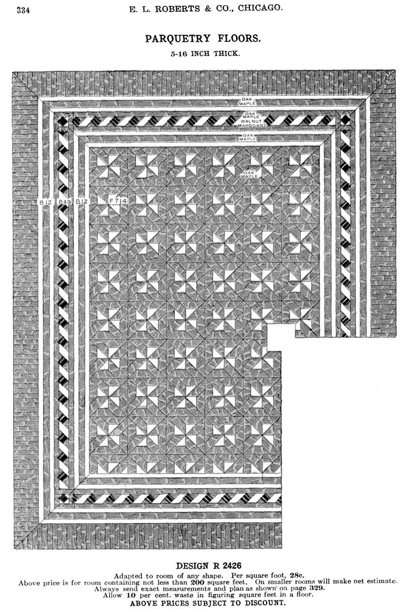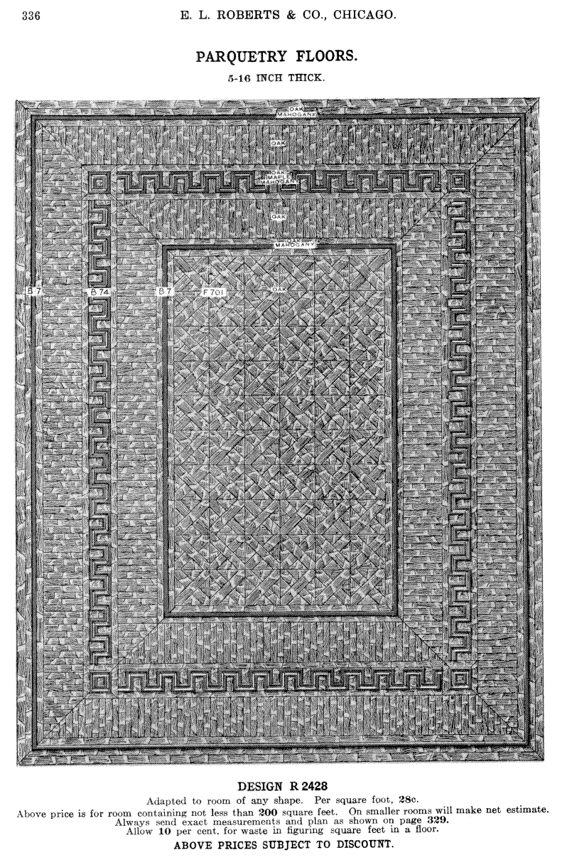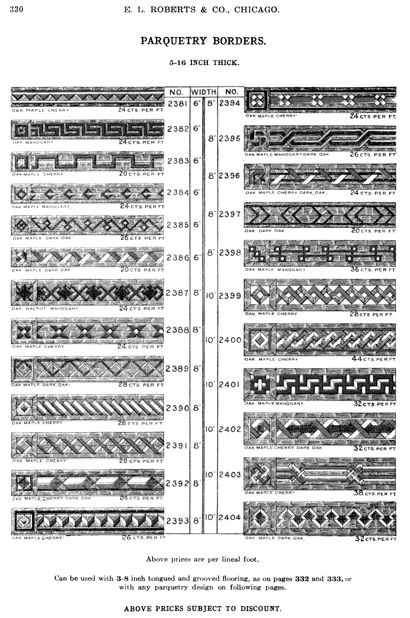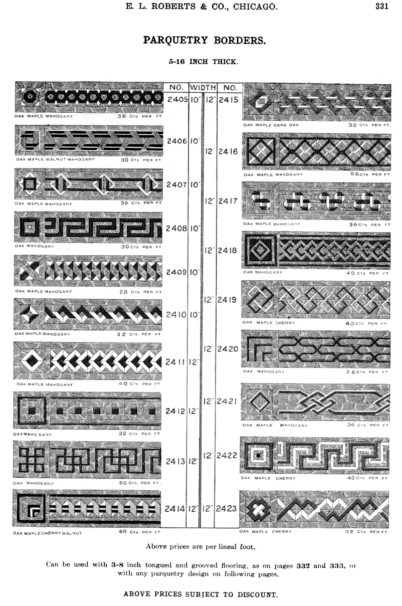 I scanned in the whole chapter on parquetry flooring from the catalog. This is all very similar in design to a lot of inlay work. The borders are pretty much a direct match to inlay strips. This page is kinda big, so you might have to be patient.